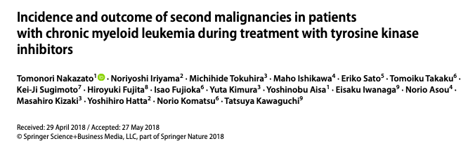 仲里朝周筆頭の論文がMedical Oncologyにacceptされました。チロシンキナーゼ阻害剤 (TKI)で治療されたCML患者における二次性発がんのまとまった報告は極めて少なく、CML-CSGのデータベースを用いて第2世代TKI使用患者の解析を行ったところ、二次性発がんの発生率は一般人と比較して同等の発症率であり、TKI治療中の二次性発がんの発生は、一般人と比較してその生存率や死亡率に影響を与えませんでした。